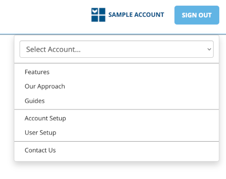 To set up the structure of your account, click on the menu icon on the top right corner of the page to access the Account Setup page: