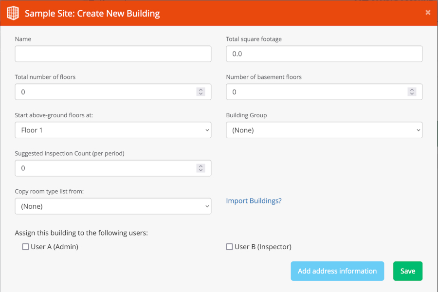 Creating a new building to add to your site can be done in two ways: Manually (one by one) via the form shown below, or via a file upload by clicking on the “Import Buildings?” link.