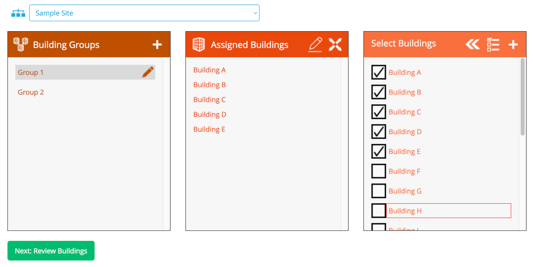 After creating a building group, you may click on its name; a “pencil” icon should show up to the right of the building group’s name (click on the pencil to rename the group if needed). The “Assigned Buildings” panel will also show the list of buildings currently assigned to the group; click on the pencil icon in that panel to edit the building list (check or uncheck individual entries in “Select Buildings” as needed). When done, click on the “merge” icon « in “Select Buildings” to confirm the building assignments.