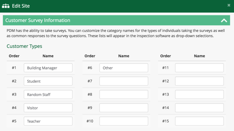 The next section is the Customer Survey information. When taking a survey on the tablet, a drop-down menu shows pre-defined names of customer types. This is the place where you edit or add the Customer Type list for that drop-down menu.
