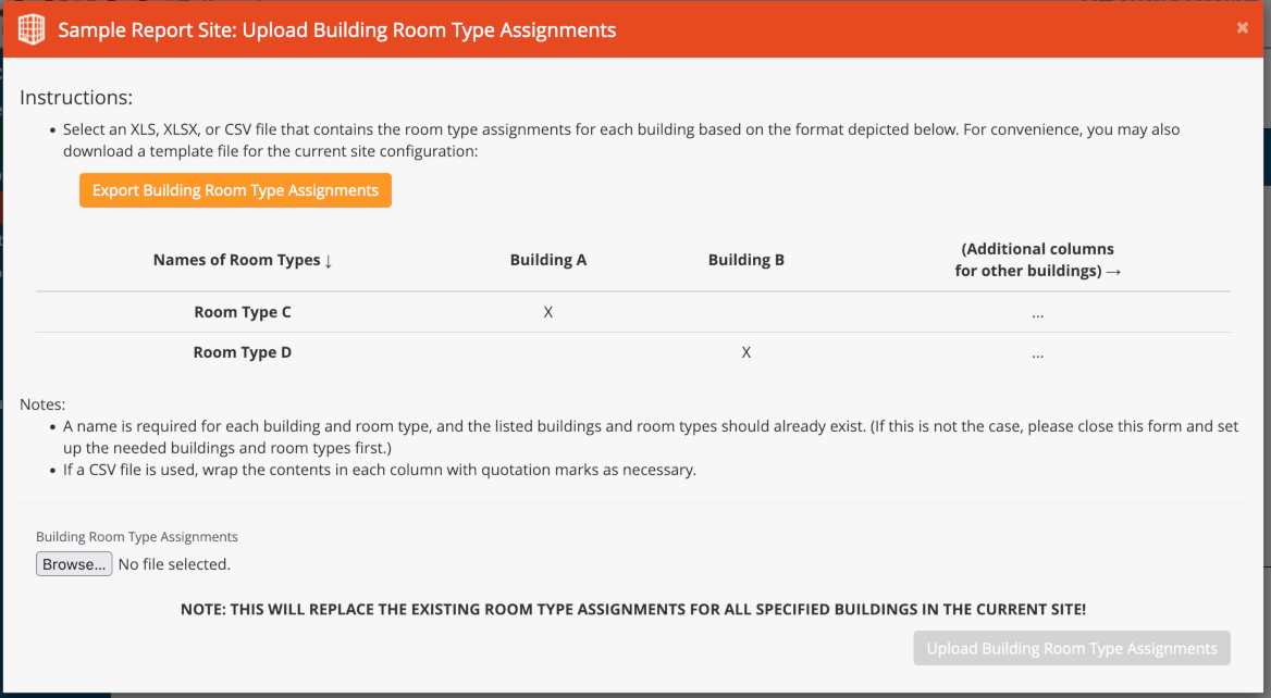 For convenience, you may use the export feature to download an Excel spreadsheet containing the current room type assignments for all buildings in the site. Edit the downloaded template, then fill in an X for each applicable combination of building and room type and re-upload the Excel spreadsheet.