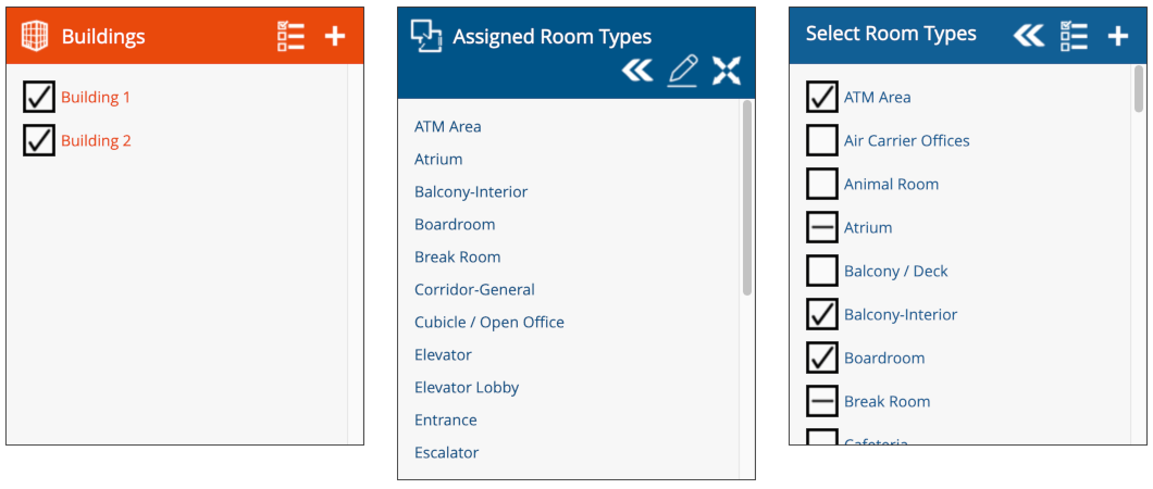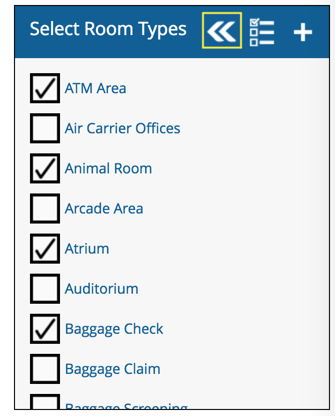 You will notice that the “Select Room Types“ panel has a list of Room Types. If multiple buildings are selected, it may be possible for some of the room types to display a — (dash) as opposed to a ✓ (check mark) next to them. This will occur if multiple buildings are selected, but a room type is present in only a subset of the buildings (but not all of them).