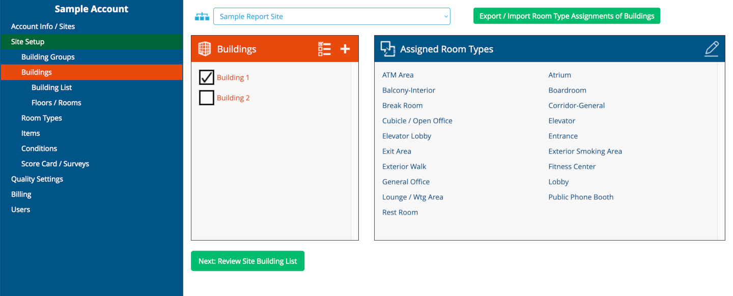 To manage the structure and contents of buildings, select the “Buildings” link on the left navigation panel. When you select a building, you will see the list of room types associated with that building. You can also select multiple buildings to see the room types associated with those buildings.