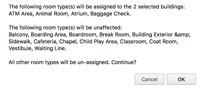For instance, if you would like the Hilton Hotel and the Marriott to have the same Room Types, you can click on the merge icon on the Room Types panel (which will show up when multiple buildings are selected). A pop-up note (which could look different depending on the browser that you are using) will ask if you want to proceed:
