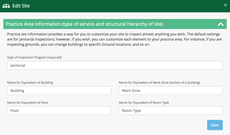 The “Practice Area” section defines the structure of many elements in your cleaning program. For now, PDM is primarily focused on janitorial services. In the future, you will be able to select between different practice areas, and the program will create elements customized to that area.