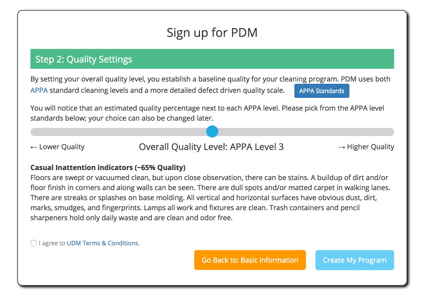 The next step is to pick a quality level or APPA quality level for your overall cleaning program. You can change these setting later. You cleaning program will be loaded with a default quality profile for each room type based on this overall quality.