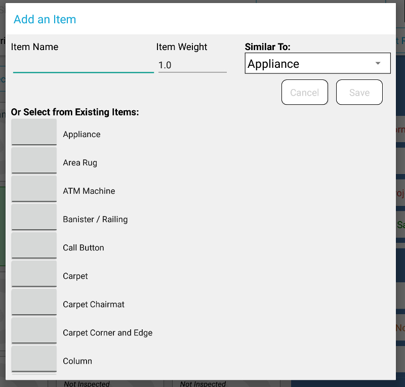 If an item that you are inspecting is not listed, you can add it by tapping the “Add Items” button. A menu item will appear with a list of items; you may select from a list of items that are not currently in that room, or start typing a name to filter that list.