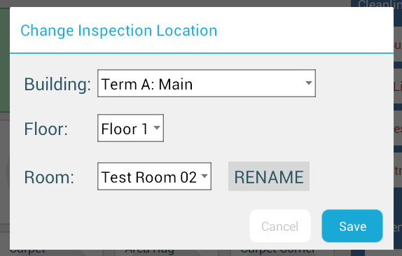As shown above, the inspector can re-assign an inspection to a different building, floor, or room; the option to rename a room is also available. After making the needed changes to the inspection locaiton, tap “Save” to return to the inspection screen.