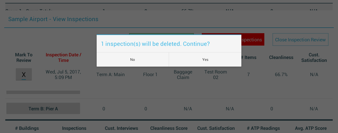 Confirm or cancel the deletion(s) by selecting No or Yes. Please note that deleting an inspection is an irreversible process; also, only the tablet’s copy of the inspection will be deleted immediately (the copy on the server will remain until you sync again).